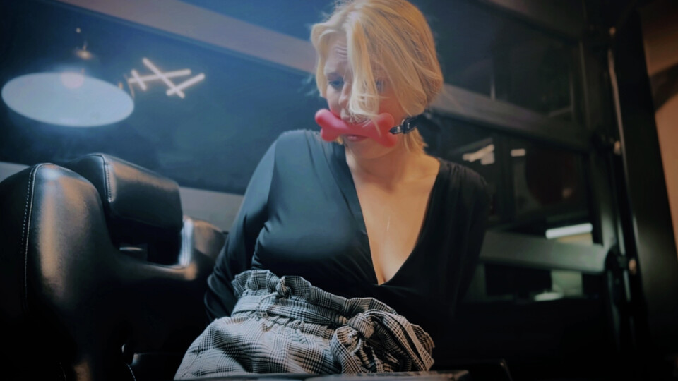 Sunny finds herself in the man's condo. Tied with rope now and secured on what appears to be a barber chair, Sunny's gag has also been changed to something from the man's personal collection picked out just for her, a pink bone gag. Sunny is desperate to escape and reach help before the man can finish his plans for her. But the bondage is too strict and the gag only allows for copious amounts of drool to come pouring out of Sunny's mouth. She is completely at the mercy of the man she trusted with her safety and there is no telling if he's going to let her go or not.